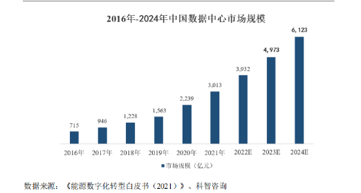 连年来,跟着5G相聚商用的持续推动,云预备、大数据、东谈主工智能等新一代本领的快速演进,聪颖城市、数字政府、工业互联网、5G 场景化等应用的赶紧发展,我国数据中心产业保持高速增长。瞻望到 2024 年,我国数据中心行业 收入瞻望将达到 6,123 亿元。