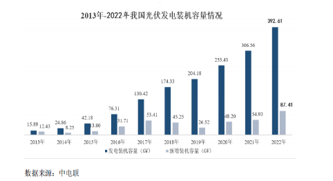 伴跟着光伏发电资本进一步裁汰以及电力市集化来回的开展,2013-2022年,我国光伏发电新增装机和累计装机容量年均复合增长率达42.81%和24.20%。瞻望“十四五”时候,我国光伏装机容量将持续普及。2022年,我国光伏发电新增装机容量达87.41GW,2023年瞻望卓绝100GW。