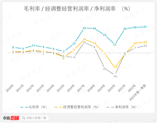 低迷的毛利率截止了经息争筹办利润率和净利润率的优化空间。2023年一季度三个方向辞别为37%,15%,10%,依然在同业中偏低。