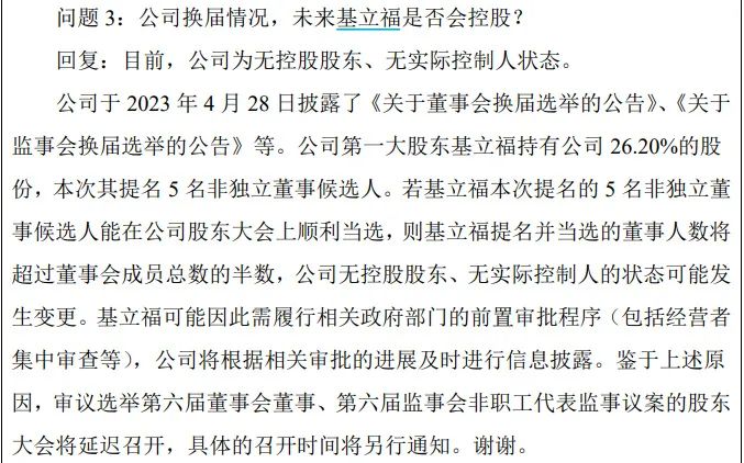 本年4月28日,上海莱士在董事会换届选举公告中暗意,若是基立福提名的5名非独处董事候选东谈主,简略在公司鼓舞大会上顺利当选,则公司无控股鼓舞、无骨子礼貌东谈主的景色可能发生变更。