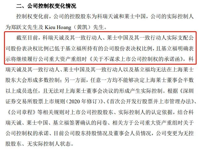 记者发现,2021年9月9日,上海莱士发布“对于公司礼貌权发生变更的教导性公告”,基立福明确暗意,将继续执行公司首要钞票重组时《对于不谋求上市公司礼貌权的欢跃函》。