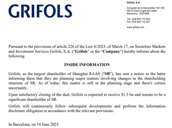 彩票棋牌6月15日,上海莱士公告称,公司于6月13日收到公司第一大鼓舞Grifols, S.A.(简称“基立福”)的讲述,基立福正在盘算推算触及公司股权变动的首要事项。