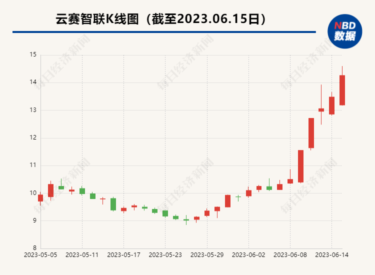 云赛智联股价近日高潮赫然,近5个往复日累计高潮35.8%。罢休6月15日收盘,该股高潮5.79%,最新市值195亿元。